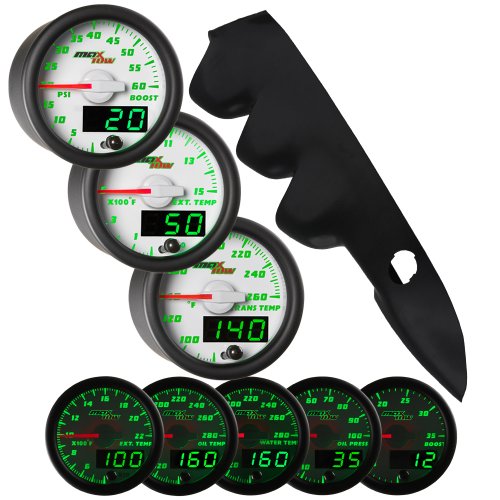 White MaxTow 00-06 GMC Sierra w/ A-Pillar Speaker Diesel Gauge Package White Face Boost, EGT & Trans Temp MaxTow's 00-06 GMC Sierra Diesel Gauge Package allows you to easily monitor your truck's vital functions while keeping your dashboard free from obstructions, and will integrate perfectly with your vehicle. Vehicle Specific Gauge Pod The included quad A-pillar pod is specifically designed for the 00-06 GMC Sierra Truck. This pod holds three 52mm (2 1/16th inch) gauges and is crafted from the highest quality ABS plastic allowing it to be easily installed to your existing A-pillar give you a custom fit and finish. Gauges Included This White MaxTow gauge package features a 60 PSI boost gauge with 6 feet of boost hose and brass compression fittings, a 1500 EGT gauge that includes an exhaust temperature probe with 6 feet of steel braided cable, as well as a transmission temperature gauge with temperature sensor all in our Double Vision® Gauge Series. These 52mm (2 1/16th inch) gauges will give you the classic look of an analog gauge while also giving you an easy to read green digital numerical readout. This gauge series also gives you multiple dimming options allowing you to your set your preferences when hitting the road during the day or the late hours of the night, and the included brightness recall function will remember the brightness setting you had on before powering your vehicle down so you won't have to reset it every time you turn your vehicle on. Ease of Install This White MaxTow gauge package comes complete with all hardware, sending units, probes, adapters, and fittings required to install your new gauges and pillar pod. All gauges include a 3 foot power wire and a 9 foot sensor wire, assuring that you will have more than enough wire for your installation. Lifetime Support MaxTow includes a one year limited warranty and lifetime technical support with every custom gauge package.